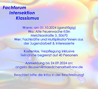Das projekt.kollektiv in Kooperation mit den Projekten IM*A (LAGM*A-NRW) und Q_munity (Queeres Netzwerk NRW) lädt herzlich pädagogische Fachkräfte, Multiplikator:innen und weitere Interessierte zu dieser ganztägigen Fachveranstaltung am 01.10.2024 nach Köln (Alte Feuerwache) ein. In diesem Rahmen werden ein eröffnendes Fachgespräch (Podium) sowie thematische, moderierte Austauschräume und die Möglichkeit zur Vernetzung angeboten. Durch das Fachforum sollen klassismuskritische intersektionale Perspektiven in unseren Tätigkeitsfeldern und Arbeitsbereichen, in unserer pädagogischen und persönlichen Praxis gestärkt werden.